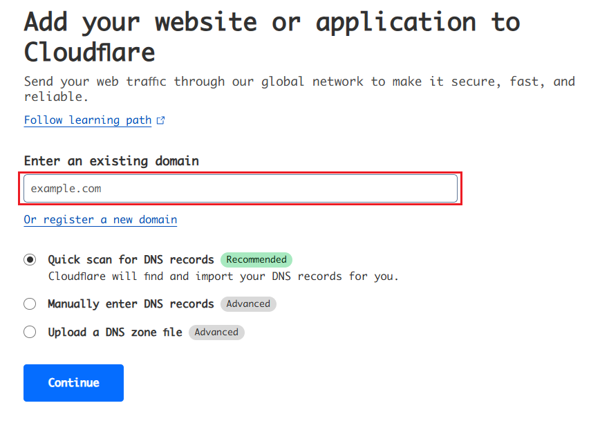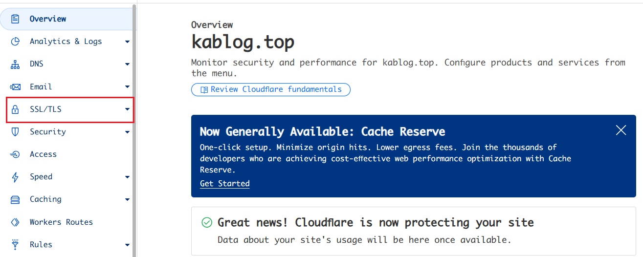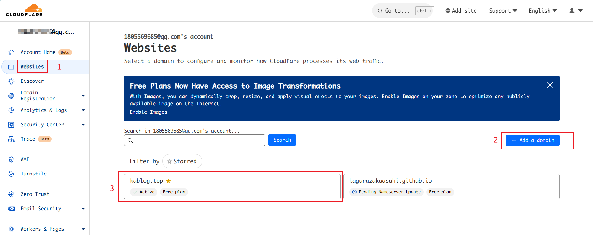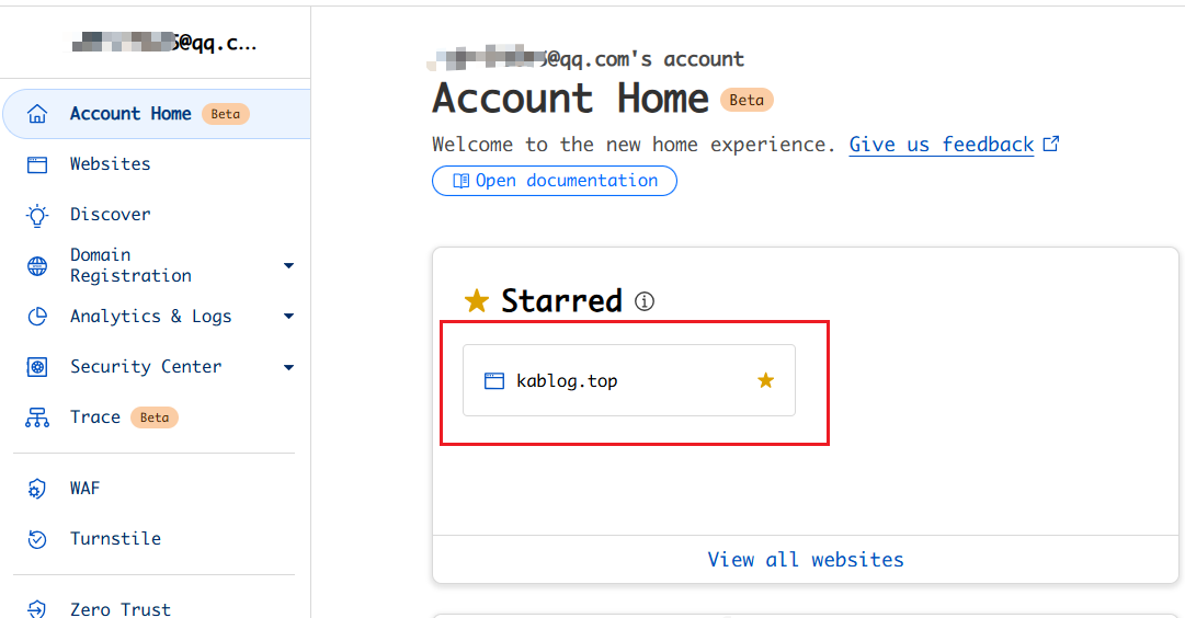 注册登录 Cloudflare , 找到 Website , 添加你的网站域名,比如我的就是 kablog.top