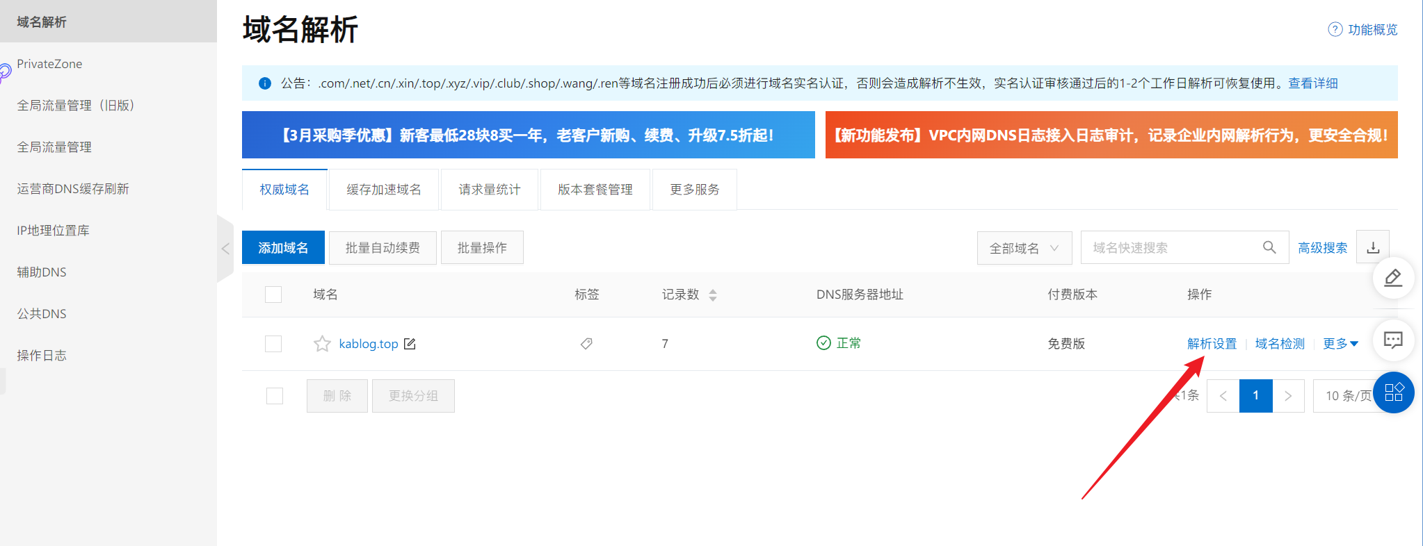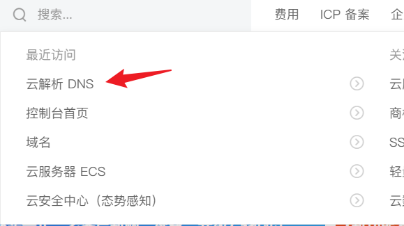 由于咱在阿里云购买了域名,故这里咱以阿里云为例,首先搜索云解析 DNS