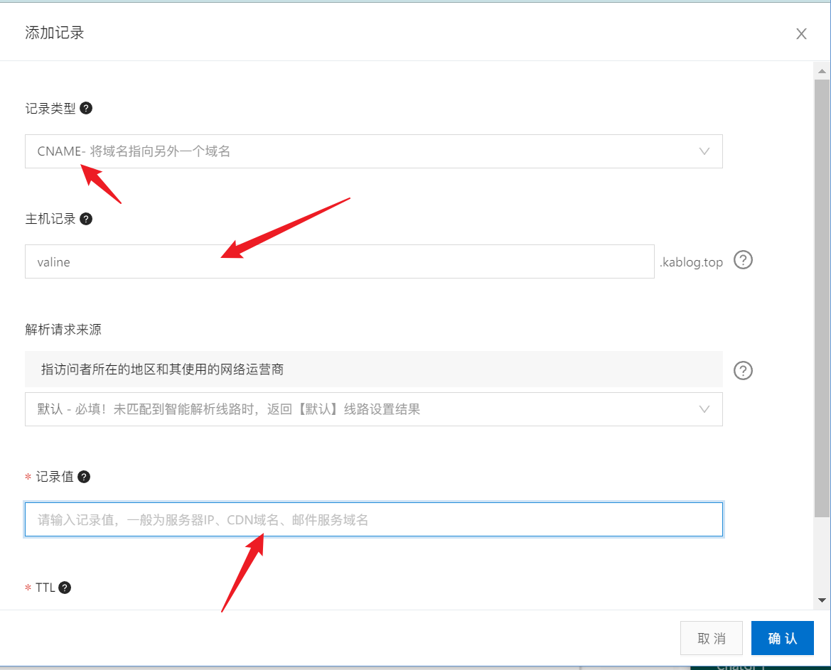 记录类型 CNAME , 主机记录随意,之后访问的前缀,记录值为之前的 CNAME